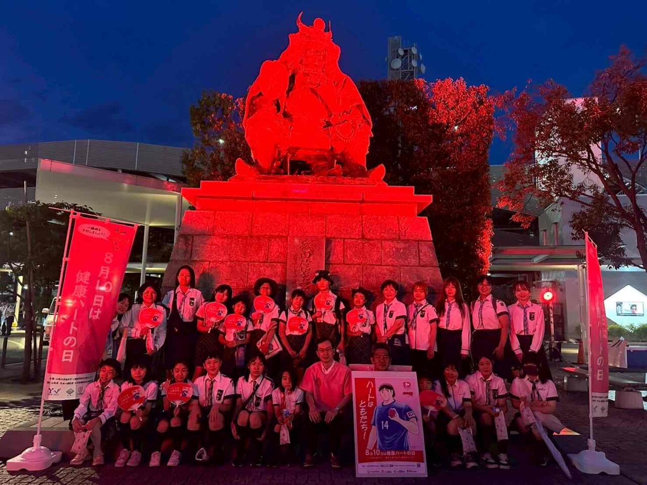 続いて19時からは武田信玄公像をハートの色である赤にライトアップしました。このライトアップは一般市民の皆さんご自身やご家族など親しい間柄の人達の心臓や心臓病について考えるきっかけになるよう願いを込めております。大勢の観客と共にカウントダウンを行い、武田信玄公像が鮮やかな赤にライトアップされました。また現地では山梨日日新聞の記者からも取材を受け心臓病の予防・啓発活動について8月11日朝刊に記事として取り上げていただきました。